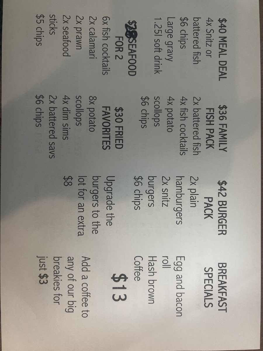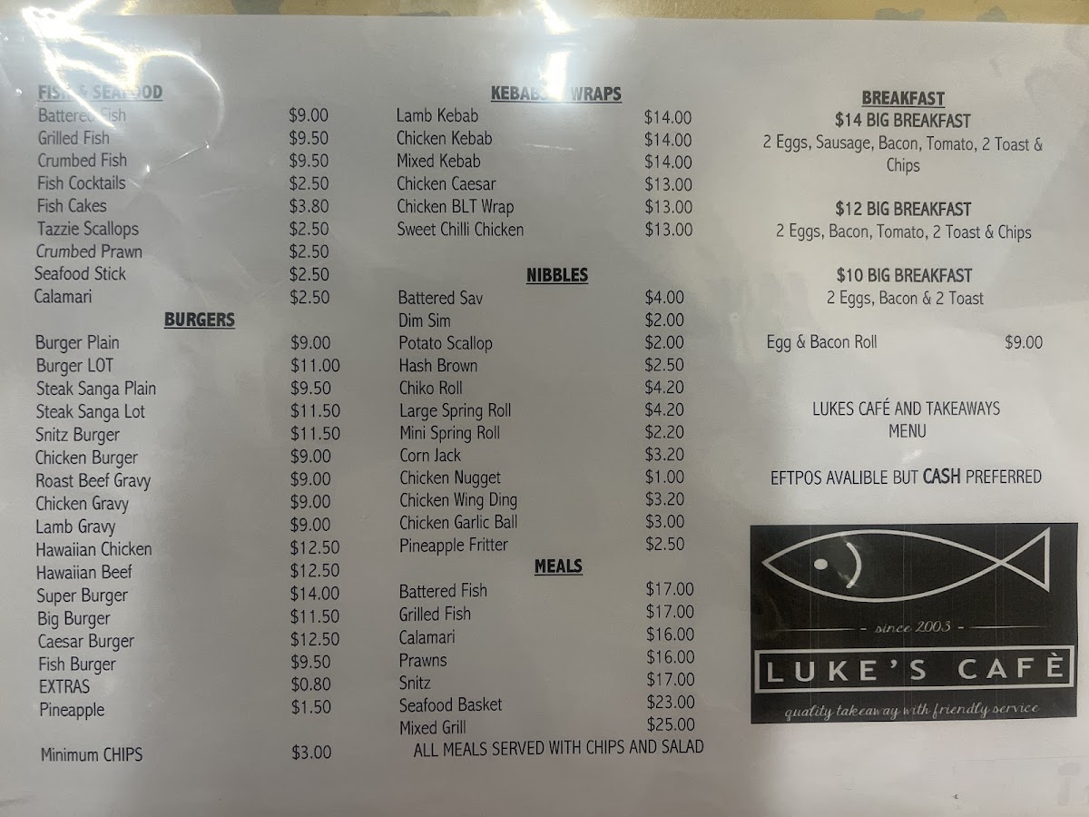 Lukes Cafe & Takeaway at 58 Pine Ave in Leeton offers a menu that is both familiar and comforting, appealing to a wide range of tastes. The Fish & Sea Od section showcases options like Grilled Fish, Crumbed Fish, Fish Cocktails, Fish Cakes, and Tazzie Scallops, highlighting their fresh seafood offerings. For something quick and satisfying, the Kebab Wraps-including Lamb Kebab, Chicken Kebab, Mixed Kebab, Chicken Caesar, and Chicken BLT Wrap-offer hearty flavors in a convenient wrap. Their Nibbles, such as Battered Sav, Dim Sim, Potato Scallop, Hash Brown, and Chiko Roll, are perfect for snacking or sharing. Breakfast lovers will find the Big Breakfast enticing, while burger enthusiasts can choose from Burger Plain, Burger Lot, Steak Sanga Plain, Steak Sanga Lot, and the Snitz Burger, each promising generous portions. The Meals section covers classics like Battered Fish, Grilled Fish, Calamari, Prawns, and Snitz, catering to those seeking a full plate. For a complete takeaway experience, combinations like Battered Fish, Chips & Can Of Drink, Grilled Fish, Chips & Can Of Drink, Plain Burger, Chips & Can Of Drink, Plain Steak Sanga, Chips & Can Of Drink, and Snitz Burger, Chips & Can Of Drink offer convenient meal deals. Overall, Lukes Cafe & Takeaway delivers a menu that balances seafood, wraps, burgers, and classic takeaway options, making it a reliable choice for both casual dining and quick bites.